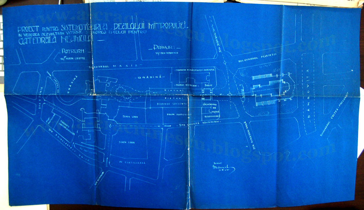 Nu putem încheia postarea fără a menționa planul de sistematizare a Grădinii Mitropoliei din perioada interbelică (vezi imaginea de mai sus, via Analiza istorico-arhitecturală). A fost elaborat în 1930 sub primariatul lui Dem I. Dobrescu și prevedea printre altele amenajarea unei piațete în spatele clădirilor bisericești mai sus menționate, la poalele Dealului, chiar în umbra Palatului Camerei Deputaților. Acestei piațete urma să i se amenajeze un dublu racord la rețeaua stradală existentă: (1) prin prelungirea străzii Olimpului dincolo de strada Principatele Unite; (2) printr’o arteră de legătură cu strada Ienăchiță Văcărescu (binecunoscutul unghi drept al acestei vechi ulițe trebuia să devină astfel un “T”). Se dorea astfel fructificarea deplină a Grădinii Mitropoliei, un teren destul de vast și neintegrat în viața modernă a orașului, practic rămas fără nici un folos din vremea Bucureștiului fanariot. Planul a fost aplicat târziu și doar în stadiile sale foarte incipiente. În acest scop, toată partea neconstruită a Grădinii a fost expropriată în 1941 (vezi Monitorul Oficial din 01.02., 16.03. și 13.07.1941). Evenimentele ulterioare (vâltoarea războiului, marasmul economic ce i’a urmat, dictatura comunistă) au suprimat însă în fașă acest proiect de sistematizare. Terenul a rămas în proprietatea Statului și a devenit grădina Palatului Marii Adunări Naționale (redevenit după Revoluție al Camerei Deputaților, astăzi noul Palat Patriarhal), dar rămas până astăzi cu amenajare minimală și fără vreo utilizare practică clară (în condițiile în care Bucureștiul nu este un oraș caracterizat prin abundența parcurilor publice, mai ales în zona centrală). Unii bucureșteni poate își mai aduc aminte că în anii ’90 originalul om politic Ion Rațiu propunea transformarea lui în teren de golf, cum văzuse el la Parlamentul britanic din Londra … Doar la unghiul drept al străzii Ienăchiță Văcărescu s’a început, se pare în anii ’80, prelungirea străzii în “T” prin exproprierea a jumătate din parcela de la nr. 24; acest început de prelungire nu a fost însă continuat în Grădina Mitropoliei propriu-zisă, astfel că se oprește tot la vechiul hotar (vezi și aici). Trebuie adăugat că la un moment dat Statul a achiziționat sau expropriat parcela din strada Principatele Unite 32 (posibil tot la sfârșitul anilor ’40) și a amenajat astfel un acces pentru acest teren (cel din strada Ienăchiță Văcărescu pe care l’am menționatnu este amenajat/folosit).
